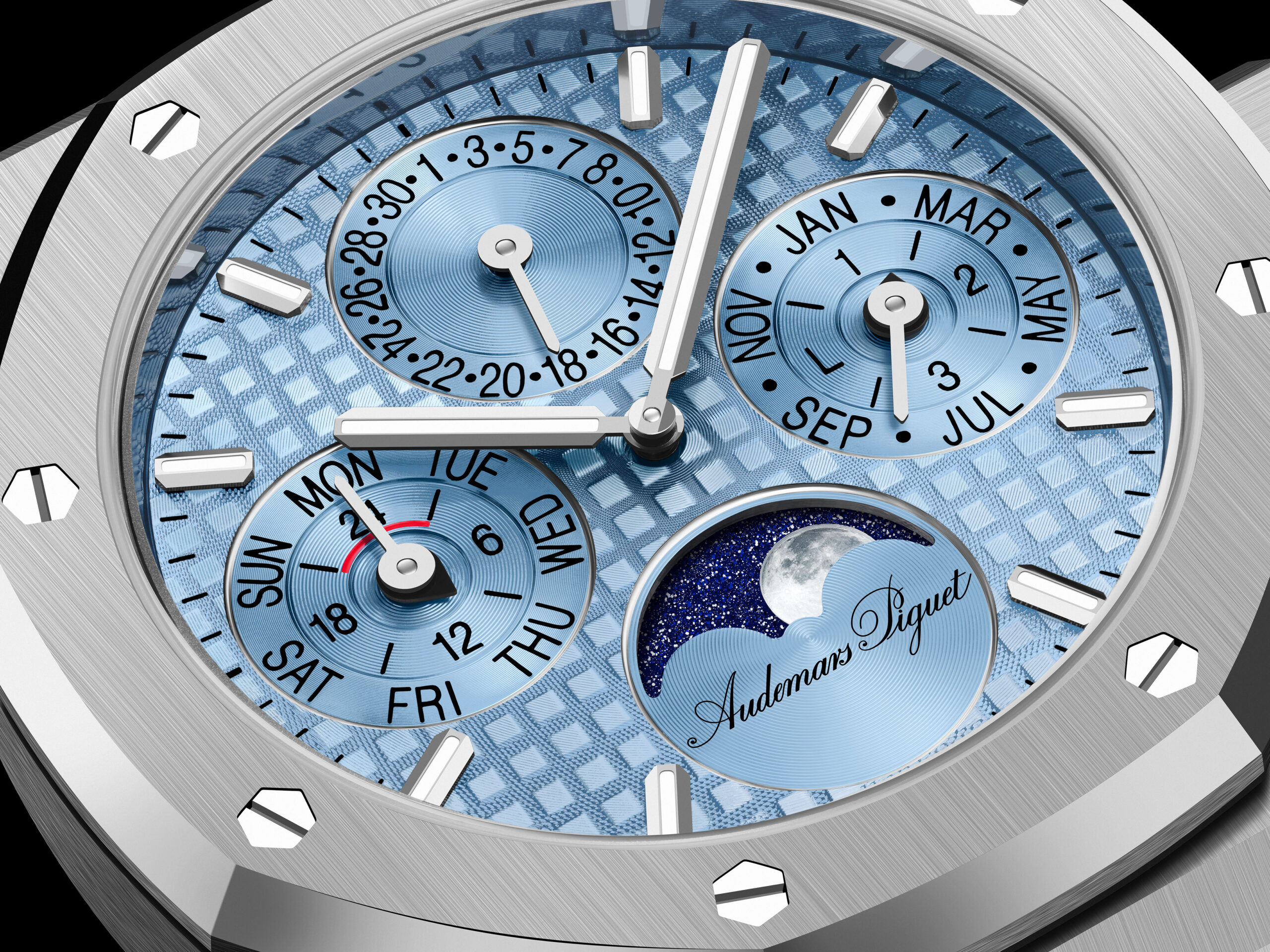 Phiên bản Royal Oak đầu tiên sở hữu vỏ và dây đeo bằng thép không gỉ, kết hợp mặt số Grande Tapisserie xanh nhạt phủ PVD cùng các mặt số phụ hoàn thiện chải xoáy. Cọc số mạ rhodium và bộ kim vàng trắng 18 carat phủ dạ quang đảm bảo khả năng hiển thị trong điều kiện thiếu ánh sáng. Các chỉ báo in đen trên mặt số phụ và viền bezel xám đánh bóng tạo điểm nhấn sắc nét.