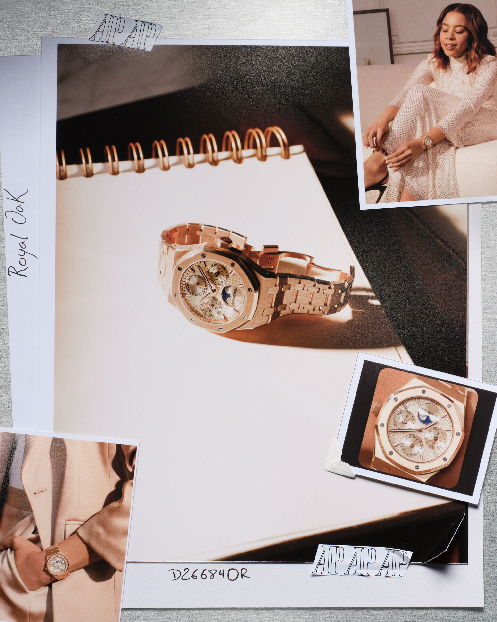 Mẫu Royal Oak còn lại mang vẻ ấm áp và tinh tế với vỏ và dây đeo vàng hồng 18 carat, kết hợp mặt số Grande Tapisserie màu be cùng các mặt số phụ đồng điệu. Bộ kim vàng hồng 18 carat phủ dạ quang cùng cọc số hài hòa trên nền mặt số, được nhấn mạnh bởi ô hiển thị lịch tuần trăng xanh lam tại vị trí 6 giờ. Các đường vát đánh bóng xen kẽ chải xước trên vỏ và dây đeo – dấu ấn đặc trưng của Audemars Piguet, khiến chất liệu kim loại bừng sáng theo từng chuyển động cổ tay.