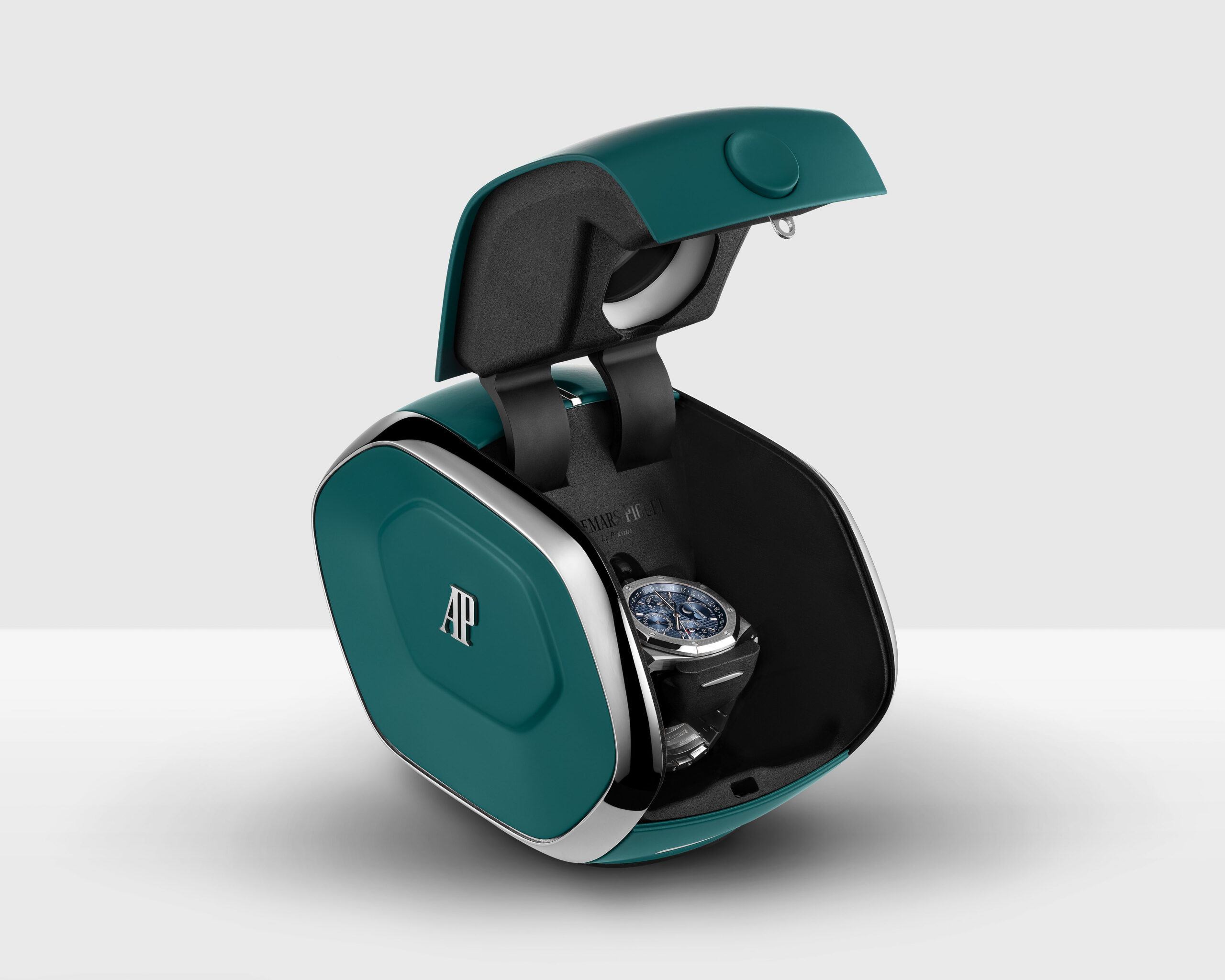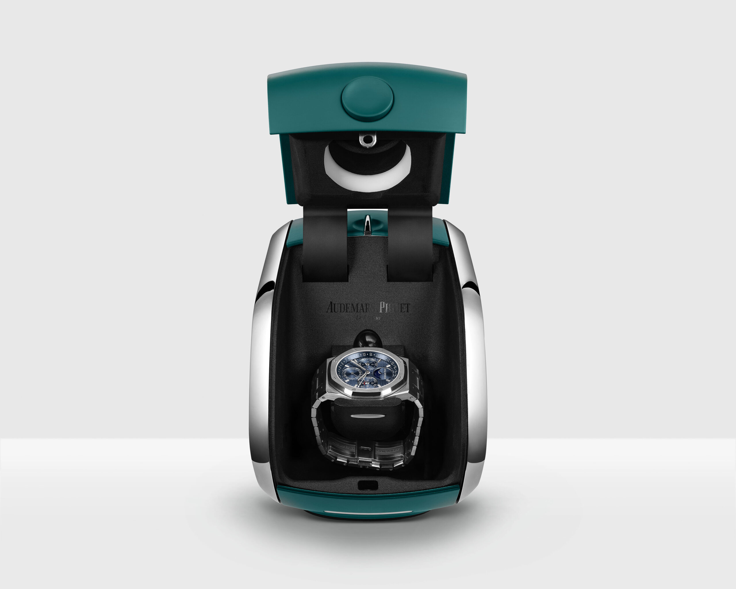 Thiết bị hỗ trợ mang tính cách mạng này mở ra một phân khúc hoàn toàn mới trong ngành đồng hồ. Hình dáng của chiếc hộp được lấy cảm hứng từ văn hóa và môi trường sáng tạo của Audemars Piguet, với những đường nét mang đến sự vững chắc, cân đối và thanh lịch. Vật liệu được thương hiệu tuyển chọn để mang lại cảm quan xúc giác và thị giác chân thực, từ bề mặt mềm mịn gợi cảm giác ấm áp và sang trọng đến các chi tiết kim loại tạo điểm nhấn mạnh mẽ.