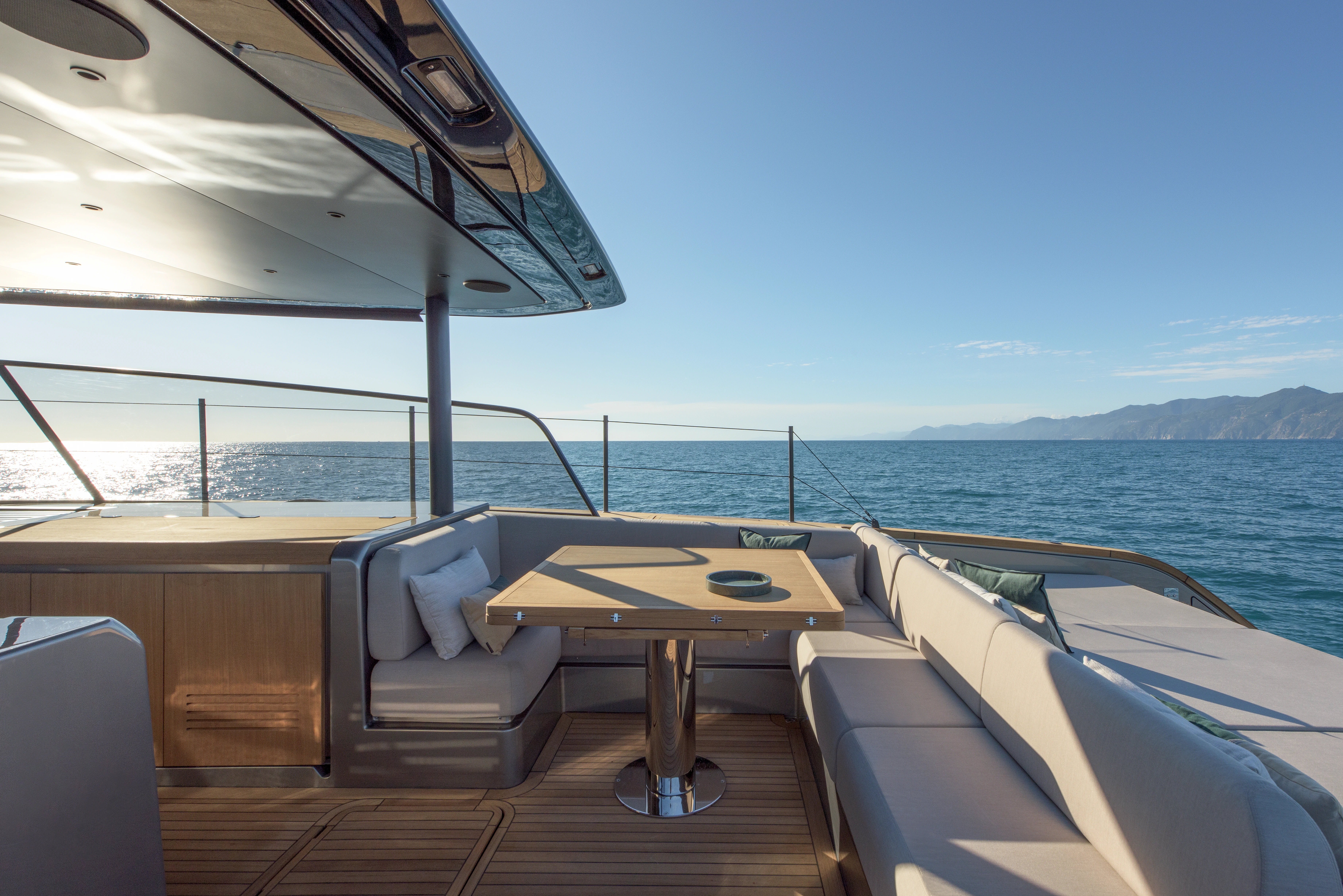 Không gian boong dưới là nơi sự thanh lịch Ý hòa cùng tiện nghi hiện đại: cabin được thiết kế tối giản nhưng ấm áp, mang đến sự thoải mái và riêng tư cho mọi vị khách. BG54, là chiếc đầu tiên của thế hệ 2.0, được tái cấu trúc với những cải tiến về ergonomics và chức năng, đem đến sự linh hoạt tối ưu cho mọi hoạt động – từ lưu trữ nội thất rời, bố trí water toys đến tổ chức những buổi gặp gỡ thân mật. Phần mũi tàu nâng cao trở thành một không gian đặc biệt, nơi bộ bàn ghế có thể chuyển đổi linh hoạt từ khu vực ăn uống thành lounge thư giãn, mở ra một góc nhìn biển hoàn toàn khác biệt.