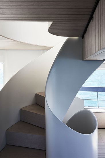 Cầu thang, vách kính, trần tàu và sàn boong được thiết kế như những đường kẻ tối giản, tinh khiết – không phô trương nhưng để lại một cảm giác gần như thiền định.