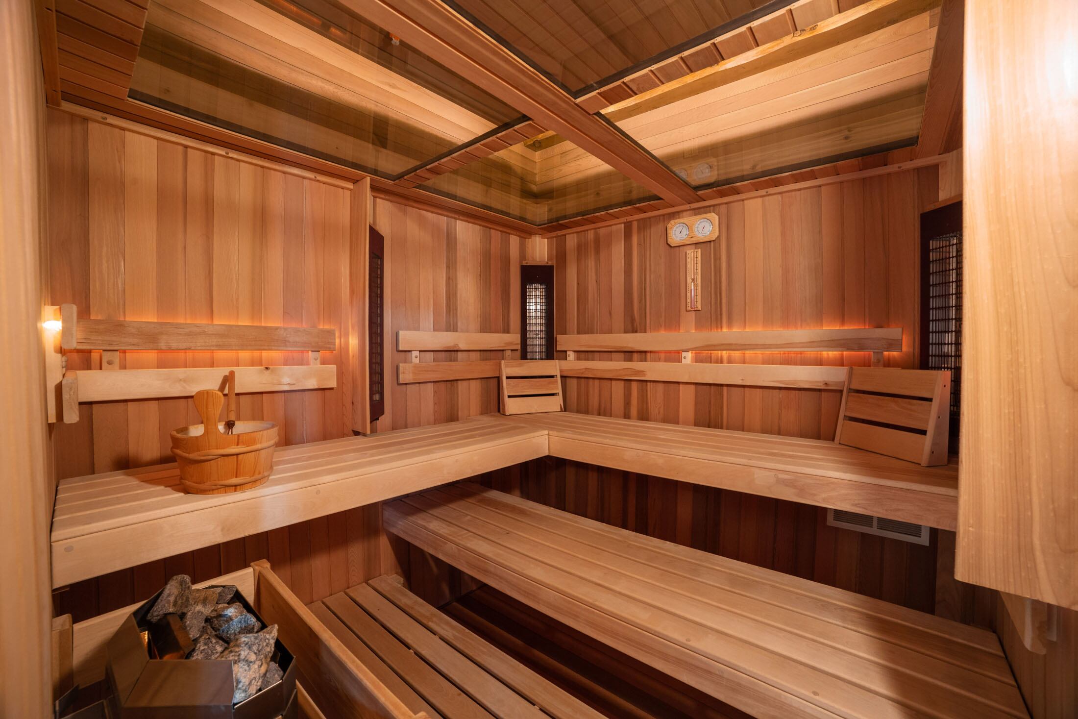 Trải nghiệm nghỉ dưỡng được hoàn thiện với hệ tiện ích mang tinh thần spa: sauna, hot tub, phòng gym và không gian giải trí, phục vụ cả thư giãn lẫn vận động. Khu nhà chính có thể tiếp đón tối đa 14 khách, trong khi guest suite riêng biệt – kết nối bằng lối đi có mái che – mang đến không gian lưu trú độc lập cho thêm 6 khách, lý tưởng cho bạn bè, người thân hoặc khách mời dài ngày.