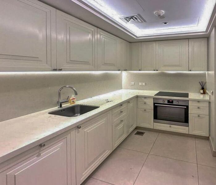 Khu bếp được trang bị thiết bị hiện đại, tủ bếp màu trắng sang trọng, mang lại sự tiện nghi và phong cách.