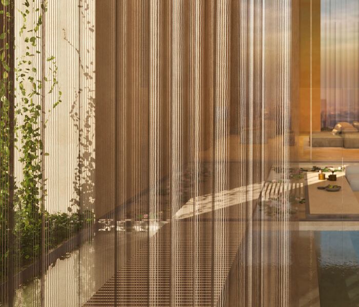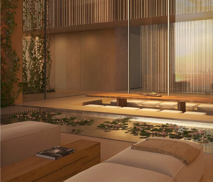 Cư dân có thể tận hưởng khung cảnh này từ những không gian ngoài trời ngoạn mục, bao gồm một khu vườn sân thượng cạnh hồ bơi riêng, cùng một hành lang ngoài trời với cửa sổ kính từ sàn đến trần và các hồ nước yên ả.