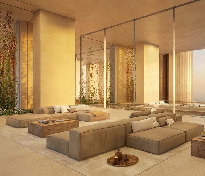 Bên trong, căn hộ nổi bật với nội thất rộng lớn, lấy cảm hứng từ những ngôi nhà Ả Rập cổ điển. Các gam màu đất được bổ sung bằng trần nhà cao, nơi những thảm cây xanh buông xuống, tạo cảm giác như một thác nước từ trên cao, đặc biệt là ở khu sân trong riêng.