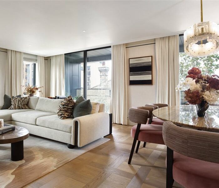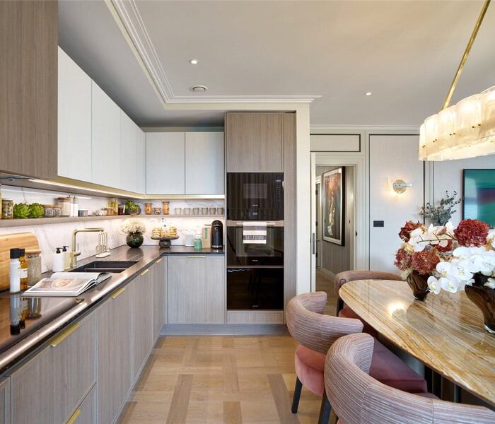 Hành lang rộng dẫn đến tất cả phòng chính tạo cảm giác tự nhiên. Khu vực khách-ăn-bếp rộng lớn thiết kế mở linh hoạt, cửa trượt kính cho phép mở rộng không gian để giải trí liền mạch hoặc đóng lại để riêng tư. Cửa sổ từ sàn đến trần ở phòng khách tràn ánh sáng tự nhiên và view ấn tượng. Bếp hiện đại với thiết bị Miele âm tường và tủ rượu Smeg sang trọng. Sàn gỗ thẳng chạy qua hành lang, bếp và phòng khách, thảm len mềm mại trong cả hai phòng ngủ.