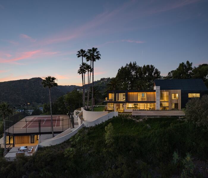 Ngoại thất được sắp đặt với độ chính xác tương đương nội thất: hồ bơi vô cực travertine vươn tới chân trời; sân tennis/bóng rổ riêng, thảm cỏ lớn, BBQ và lò sưởi ngoài trời hoàn thiện khuôn viên. Ở rìa điền trang, cửa garage treo gỗ gụ cao 40 feet, ứng dụng kết cấu moment frame, tạo mặt đứng liền mạch, không gián đoạn.