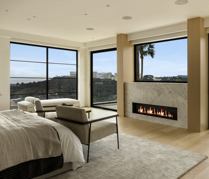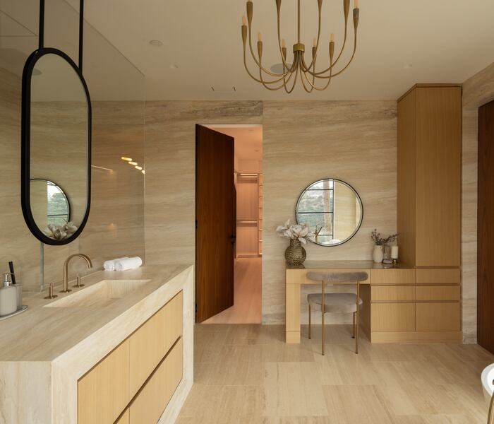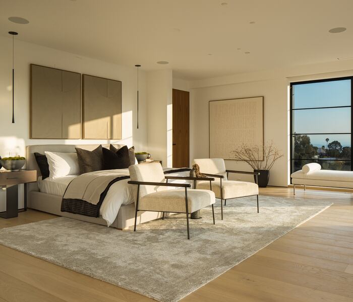 Trên tầng trên, sự tĩnh tại ngự trị. Mỗi phòng ngủ en-suite được thiết kế để đón trọn bản hòa ca ánh sáng tự nhiên và cảnh quan xung quanh. Phòng ngủ chính với cửa sổ trục xoay trung tâm và ban công riêng, như một phòng trưng bày hướng về đường chân trời. Hai phòng tắm ốp travertine từ sàn tới trần gợi vẻ đẹp khối đá của Getty; bồn rửa treo “liền khối” nâng những nghi thức thường nhật thành trải nghiệm xa hoa.