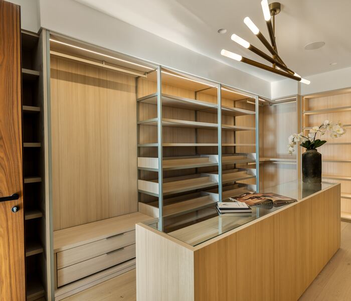 Khu bếp Molteni & C Dada — đỉnh cao của thủ công Ý — nổi bật với đá Calacatta ghép đối xứng, bếp PITT, hai đảo bếp đặt lệch tạo hình khối điêu khắc cùng nhiều khu ngồi linh hoạt. Phía sau là pantry dành cho đầu bếp được trang bị đầy đủ, lý tưởng cho tiệc tối và sự kiện. Khu bar kết hợp bề mặt travertine với kệ mở khung kính gương khói gân, mảng ốp walnut âm tường và kệ chiếu sáng LED — thiết kế để “hé lộ” tinh tế hơn là phô bày. Kề bên là hầm rượu kiểm soát nhiệt độ dành cho 190 chai, một lời tri ân lặng lẽ tới những người yêu vang.