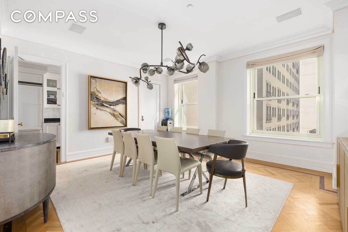 Phòng ăn rộng rãi và sang trọng, sở hữu hai cửa sổ lớn hướng Tây, đủ thoải mái để tổ chức những bữa tiệc đông người hoặc các buổi họp mặt thân mật. Nhà bếp có cửa sổ, được trang bị bộ thiết bị bếp bằng thép không gỉ cao cấp của Viking và Miele thuộc bộ sưu tập Plaza, mặt bàn đá Nero Marquina sang trọng và tường ốp mosaic đá cẩm thạch trắng.