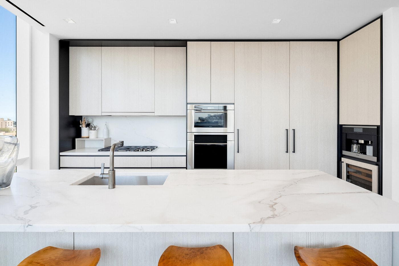 Từ sảnh thang máy riêng, lối vào mở ra khu foyer sang trọng dẫn đến không gian phòng khách – bếp mở ấn tượng. Toàn bộ khu vực được bao quanh bởi hệ kính từ sàn đến trần, ôm theo đường cong mềm mại của tòa nhà, mang lại ánh sáng tự nhiên tối đa và tầm nhìn hướng Bắc – Tây. Nhà bếp thiết kế bởi David Mann, sử dụng nội thất Molteni cao cấp, mặt đá cẩm thạch Calacatta Borghini và trang bị đầy đủ thiết bị từ các thương hiệu hàng đầu như Wolf, Miele và Sub-Zero – lý tưởng cho cả sinh hoạt hàng ngày và tiếp khách.