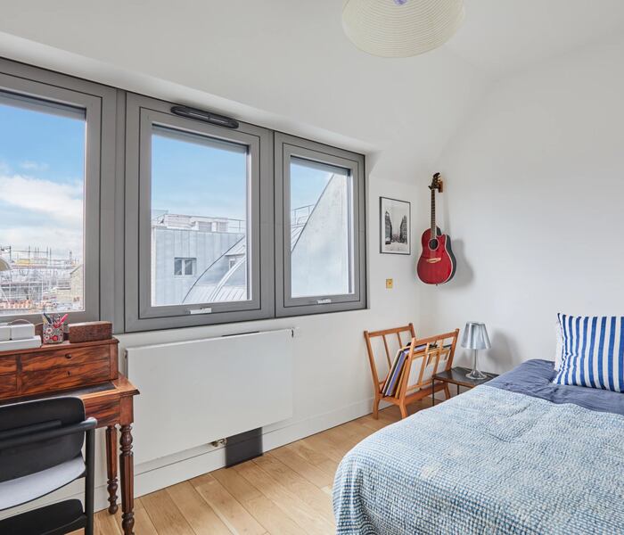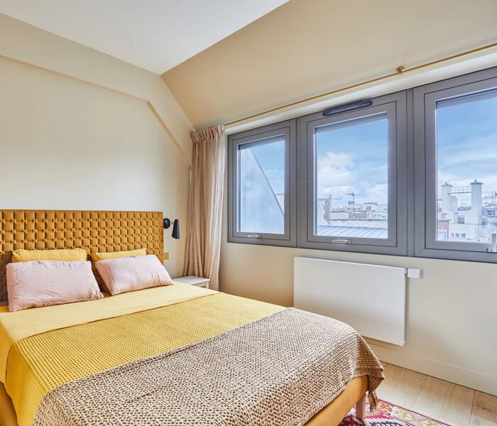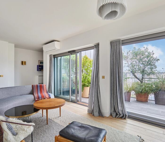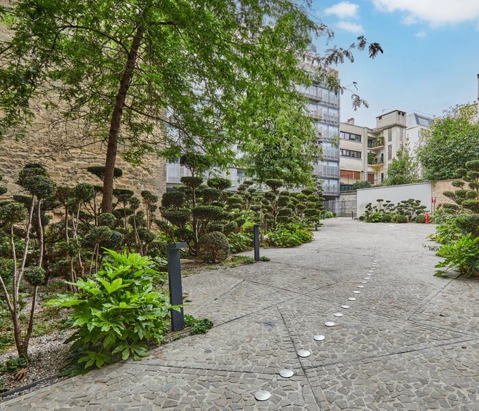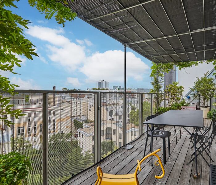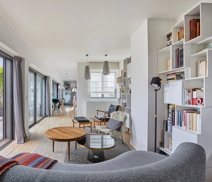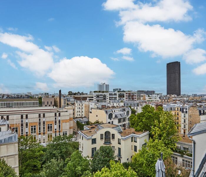 Trong khung cảnh xanh mướt, tại tầng trên cùng của tòa nhà cao cấp từ những năm 2020, căn hộ 92m² này có sân thượng có nội thất 25m² với cây xanh và view nhìn ra Paris.