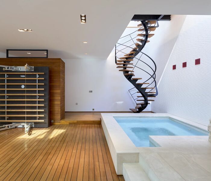 Khu phụ gần 125 m² được trang bị hồ bơi và phòng tập thể dục với spa. Có ba chỗ đỗ xe trong vườn và hai chỗ đỗ xe khác trên phố riêng.