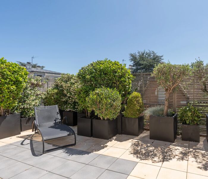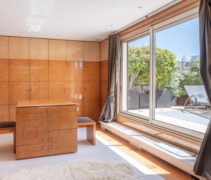 Kín đáo và riêng tư, ngôi nhà có hơn 50 m² sân hiên ngập tràn ánh sáng. Bất động sản được trang bị thang máy kết nối cả bốn tầng, bao gồm năm phòng ngủ, trong đó có một suite chính (master suite) đẳng cấp. Ngoài ra, có thể bố trí thêm một phòng ngủ nếu cần.