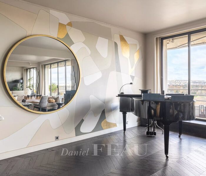 Không gian sinh hoạt chính gồm phòng khách – tiếp khách ba khu vực rộng khoảng 120 m², tràn ngập ánh sáng tự nhiên và mở ra ban công liên tục rộng 20 m² với tầm nhìn thoáng đãng về La Défense và Mont Valérien. Căn hộ còn có ba phòng ngủ, trong đó hai phòng đi kèm phòng tắm riêng, một phòng tắm đứng bổ sung, khu hammam thư giãn và WC dành cho khách.