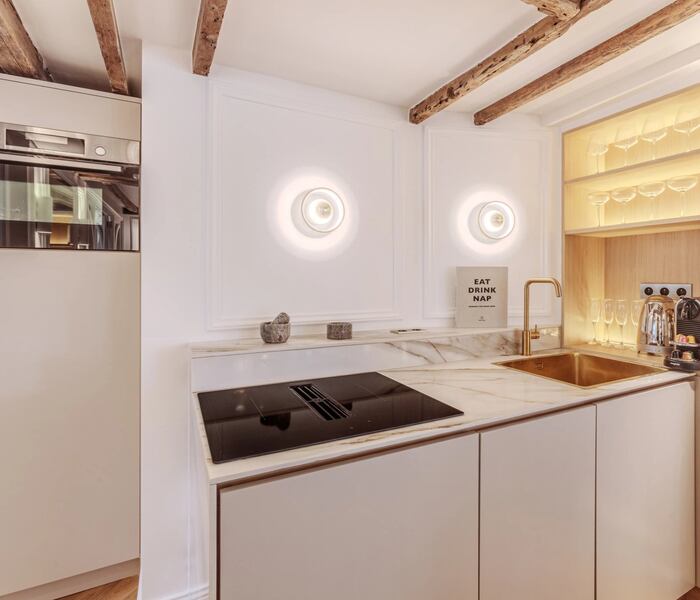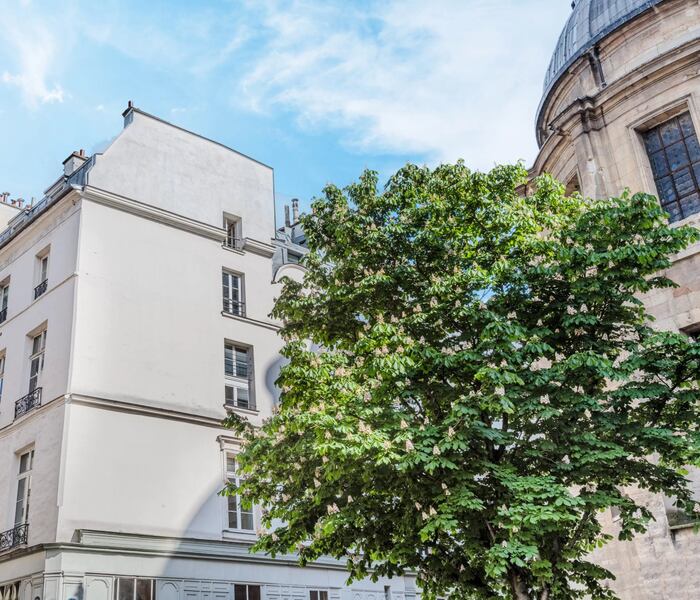 Căn hộ có diện tích 40,49 m² này nằm trên tầng 4 của một tòa nhà cổ điển đầu thế kỷ 19, được trang bị thang máy, tọa lạc giữa khu vườn Luxembourg xanh mát và khu phố Saint-Germain-des-Prés biểu tượng của Paris. Không gian bên trong được thiết kế tinh tế, bao gồm phòng khách rộng rãi với khu ăn uống, bếp mở hiện đại, một phòng ngủ riêng, phòng thay đồ tiện nghi, phòng tắm kết hợp toilet và khu giặt nhỏ gọn. Toàn bộ căn hộ đã được cải tạo hoàn toàn và được trang bị hệ thống điều hòa không khí. Những xà gỗ lộ thiên cùng tầm nhìn tuyệt đẹp ra nhà thờ Saint-Sulpice mang lại nét duyên dáng cổ điển đặc trưng của Paris. Nằm trong khu vực trung tâm sôi động Rive Gauche, cư dân có thể dễ dàng tiếp cận các quán cà phê, cửa hàng thời trang, bảo tàng và công viên nổi tiếng. Căn hộ được bán kèm toàn bộ nội thất, có thêm hầm chứa đồ tiện dụng.
