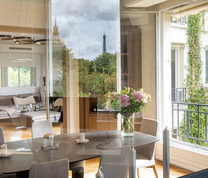 Giữa kinh đô ánh sáng, hiếm có căn hộ nào sở hữu vị thế đáng mơ ước như nơi đây – toạ lạc giữa khu Barbet de Jouy và Invalides, trái tim lịch sử và hành chính của Paris. Từ ban công tầng bốn, tầm nhìn mở ra song song hai biểu tượng bất tử – mái vòm vàng rực của Invalides và Tháp Eiffel kiêu hãnh trong nắng chiều. Ẩn mình trong tòa nhà Art Deco sang trọng, căn hộ là tuyệt phẩm dành cho những ai tìm kiếm một chốn an cư thanh lịch giữa Paris – vừa là không gian sống tinh tế, vừa là tài sản sưu tầm mang giá trị vững bền theo thời gian.