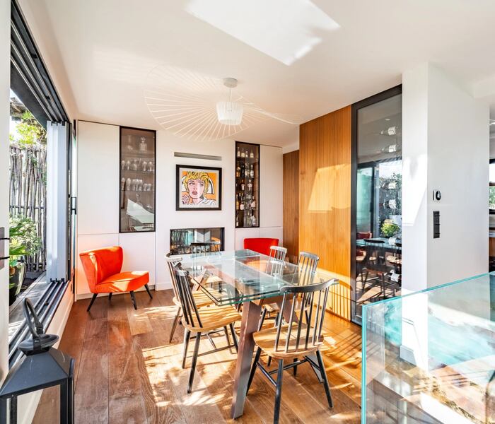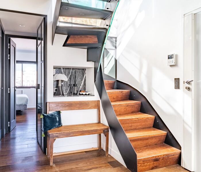 Căn hộ duplex hai mặt thoáng, diện tích 160 m², có hệ thống điều hòa và đang trong tình trạng hoàn hảo, nằm trên các tầng cao của một tòa nhà đẹp từ những năm 1920, ngay ranh giới Quận 7 danh giá của Paris.