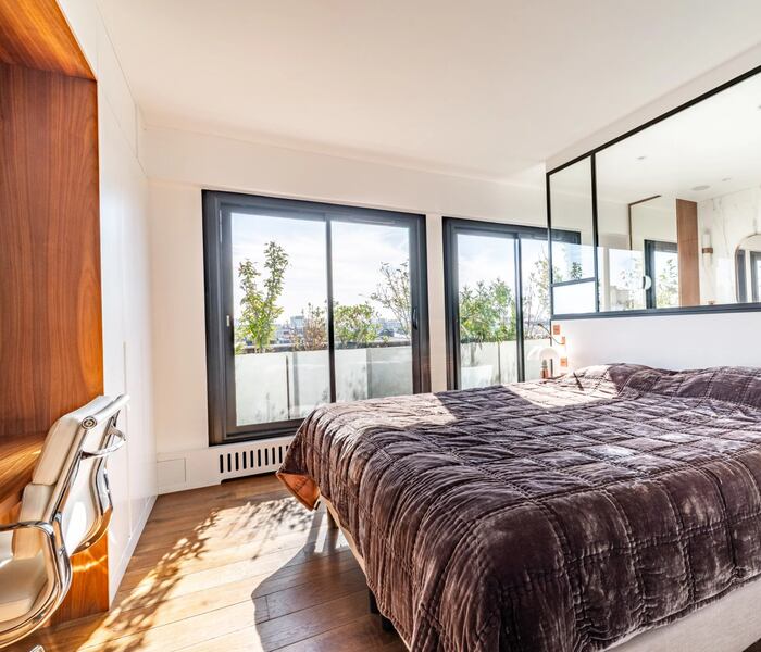 Tràn ngập ánh sáng và sở hữu một sân thượng cùng các ban công tuyệt đẹp với tầm nhìn toàn cảnh ra Tháp Eiffel và nhiều biểu tượng nổi tiếng khác của thành phố, căn hộ gồm một phòng khách/tiếp khách sáng sủa, một phòng ngủ chính (master suite) với phòng tắm có bồn và buồng tắm đứng kèm WC, ba phòng ngủ có phòng tắm riêng, một phòng giặt và một WC tách biệt.