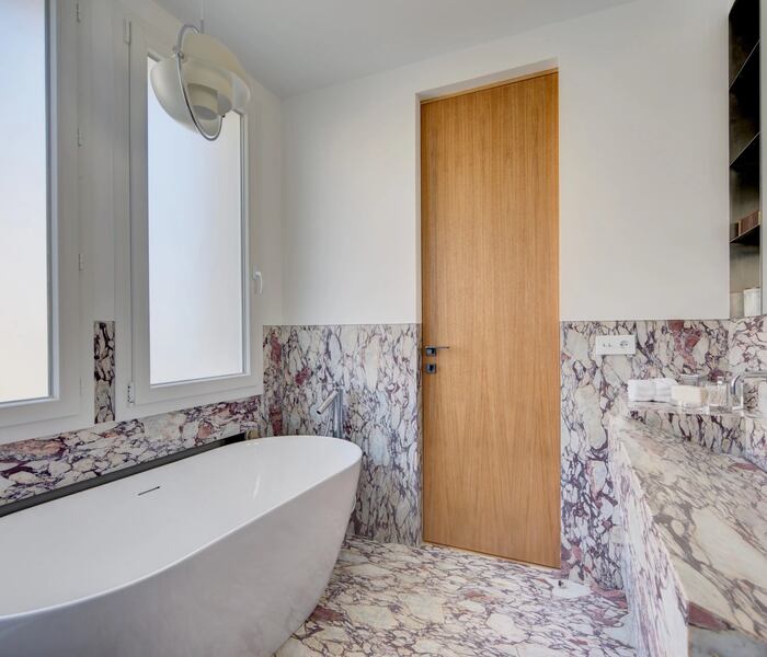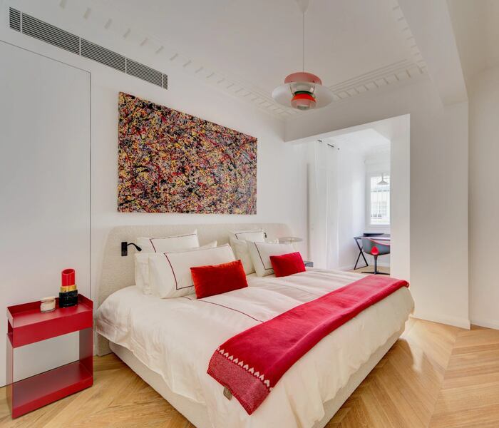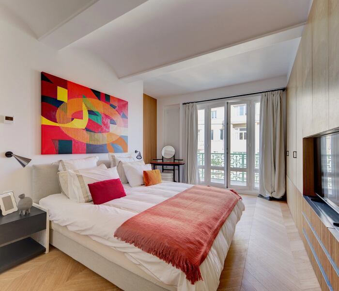 Các chi tiết kiến trúc nguyên bản như sàn gỗ parquet và phào chỉ trần tường được bảo tồn hài hòa cùng những yếu tố nội thất đương đại tinh tế. Căn hộ được trang bị hệ thống điều hòa không khí, mang lại sự tiện nghi tối ưu quanh năm.