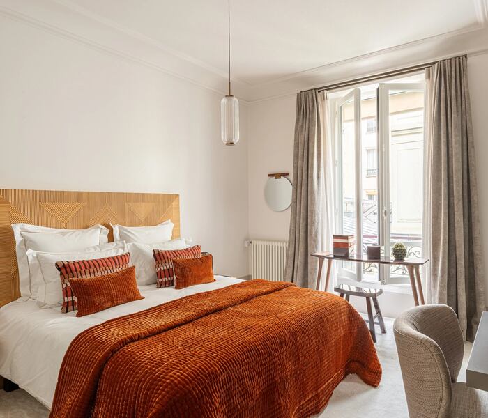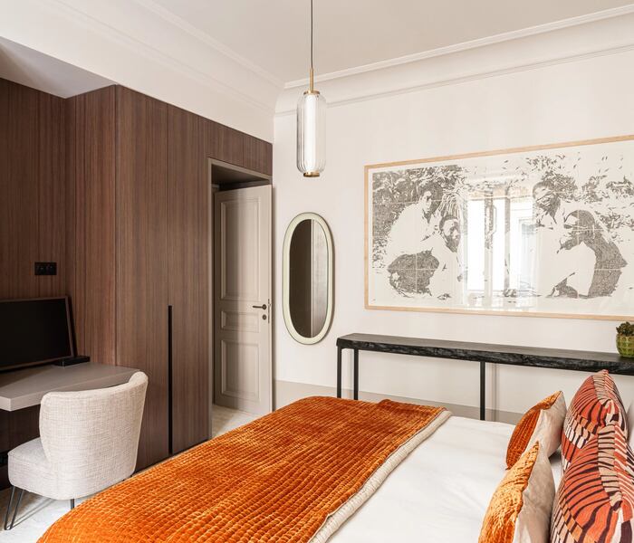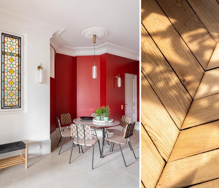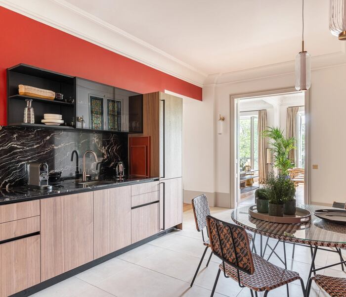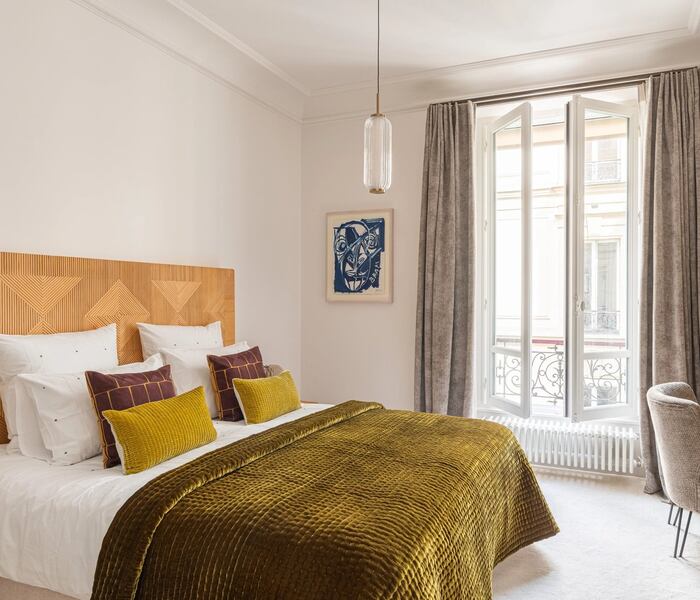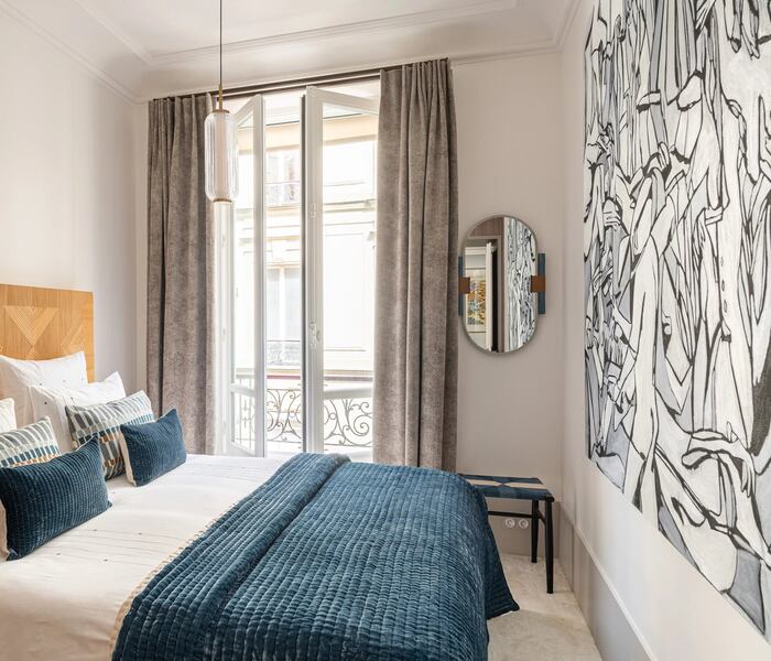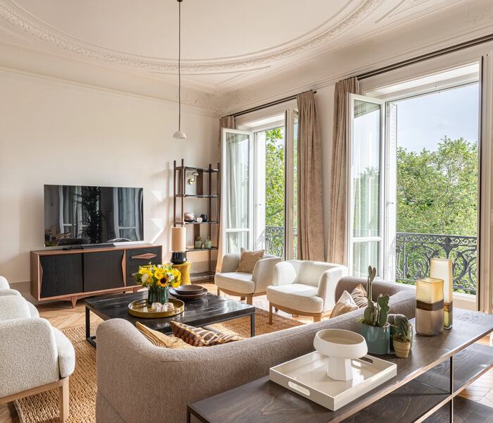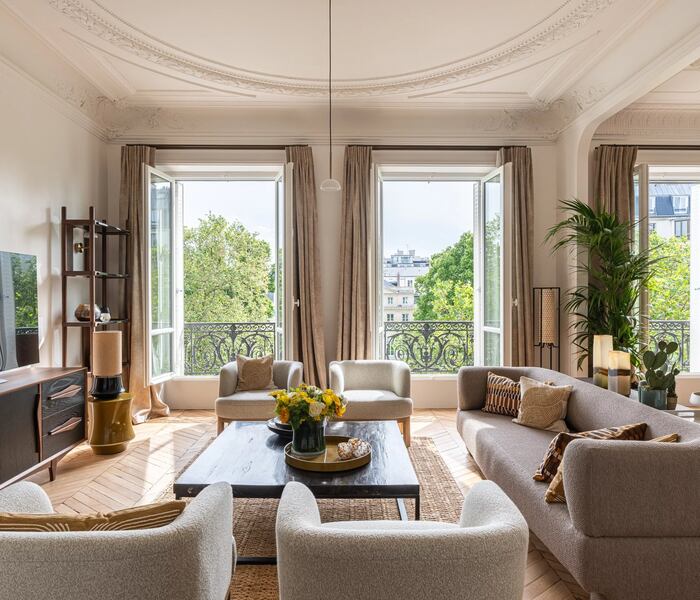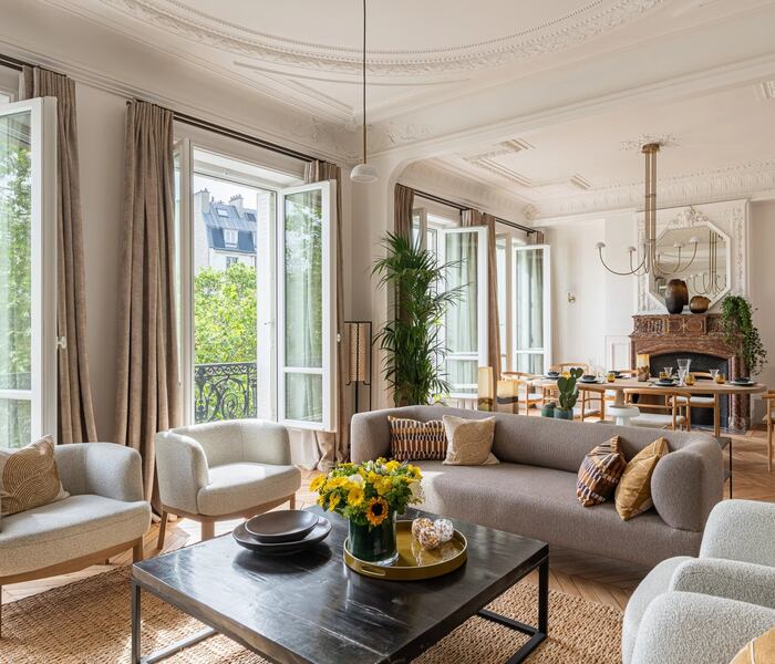 Không gian bên trong đã được cải tạo công phu, kết hợp hài hòa giữa nét duyên dáng cổ điển và tiện nghi đương đại. Những chi tiết kiến trúc nguyên bản như lò sưởi tinh xảo, gờ tường chạm trổ tỉ mỉ, cùng hầm rượu riêng biệt được bảo tồn một cách trân trọng, tôn lên khí chất Paris vượt thời gian.]