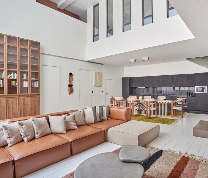 Bên trong là phòng khách/tiếp khách tràn ngập ánh sáng với hệ cửa kính lớn ấn tượng và trần cao lên tới 9 mét, tạo cảm giác không gian ngoạn mục. Khu bếp mở được trang bị và lắp đặt đầy đủ, bốn phòng ngủ rộng rãi với hệ tủ âm tường tiện nghi, ba phòng tắm vòi sen (trong đó hai phòng có WC), cùng một WC riêng biệt, hoàn thiện bố cục chức năng của căn hộ.