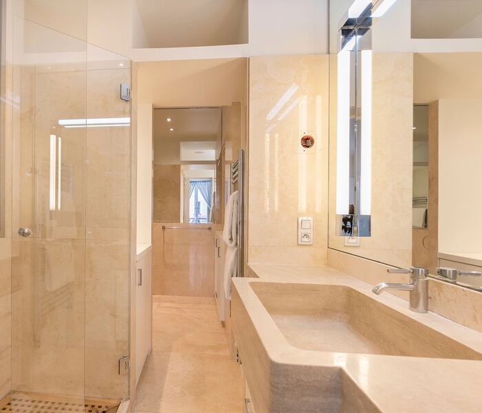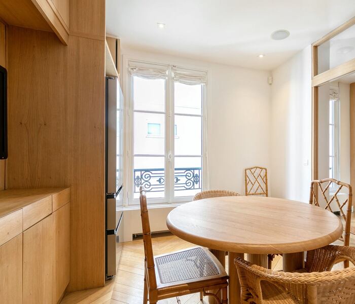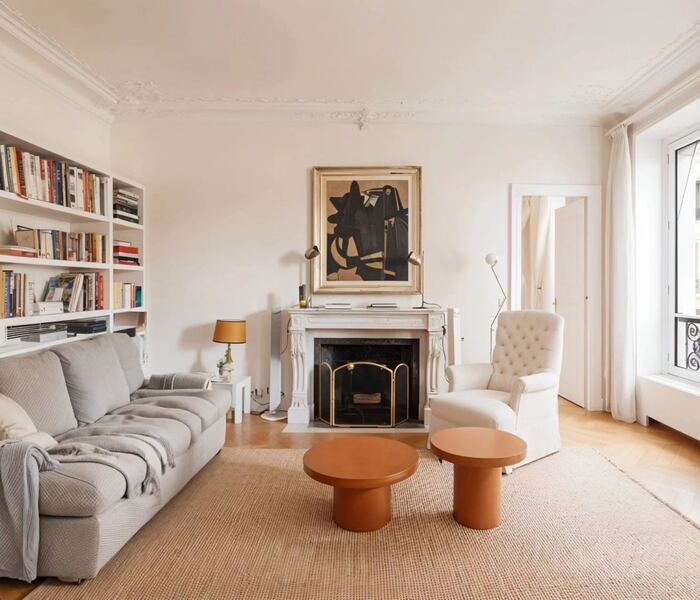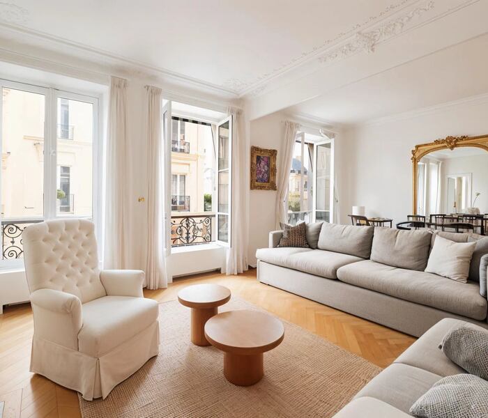 Không gian tiếp khách rộng rãi, sang trọng, nổi bật với lò sưởi đang hoạt động và hệ cửa sổ lớn mở ra cảnh quan xanh mát của khu vườn, mang lại bầu không khí thanh lịch và yên tĩnh hiếm thấy giữa lòng Paris. Khu bếp La Cornue được trang bị đầy đủ tiện nghi cao cấp, kết hợp khu vực ăn uống, lý tưởng cho cả sinh hoạt gia đình lẫn tiếp đãi trang trọng. Căn hộ còn có phòng ăn riêng biệt và phòng làm việc rộng, hoàn toàn có thể chuyển đổi thành phòng ngủ bổ sung nếu cần.