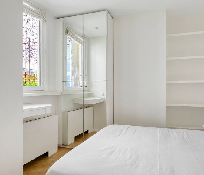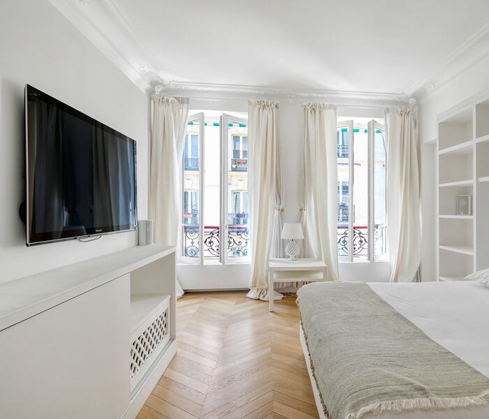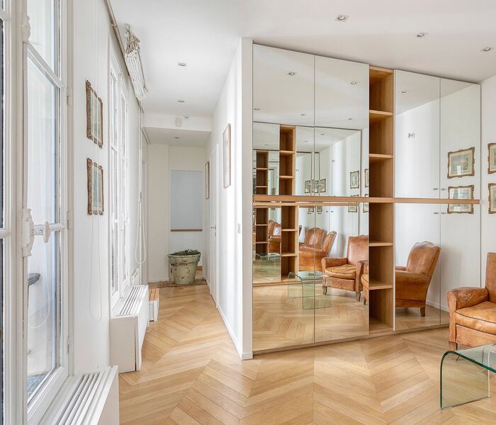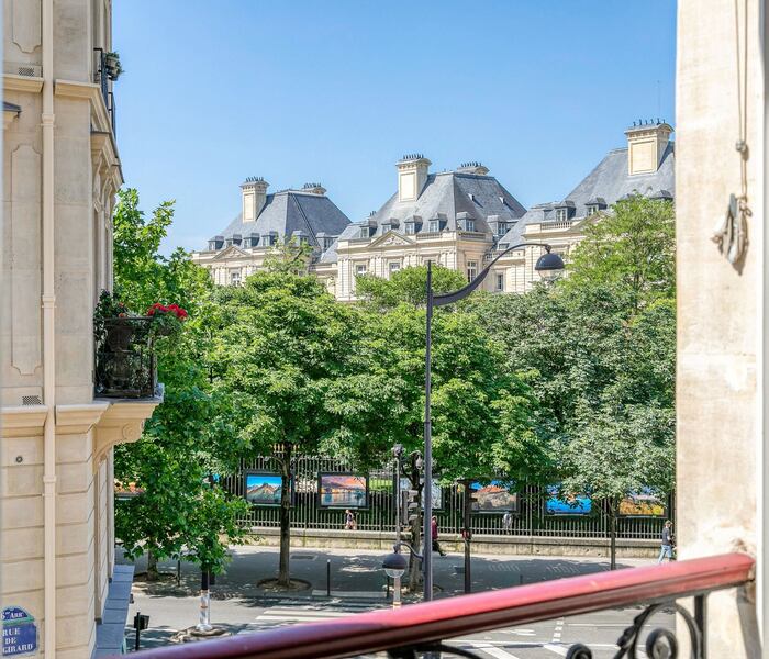 Căn hộ có diện tích 180 m², tọa lạc tại tầng hai của một tòa nhà trang nhã thế kỷ XIX, được trang bị thang máy và dịch vụ quản gia, đồng thời sở hữu tầm nhìn hiếm có hướng ra Thượng viện Pháp (Sénat) và khu vườn Luxembourg Gardens danh tiếng.