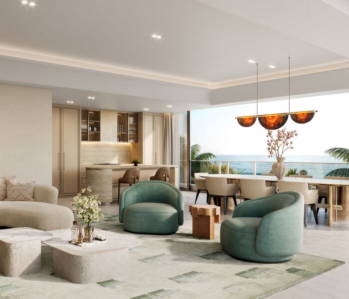 Khu vực sinh hoạt rộng rãi lấy cảm hứng từ môi trường tự nhiên xung quanh với các gam màu đất, vật liệu hoàn thiện tinh tế và những khung cửa sổ ấn tượng. Thiết kế hiện đại của Pelli Clarke & Partners đã biến căn hộ thành một chốn nghỉ dưỡng riêng tư, nơi vẻ đẹp của đại dương được đưa vào không gian sống.