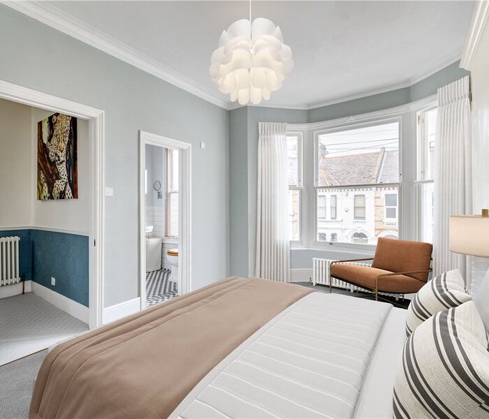 Tầng một gồm khu vệ sinh dành cho khách/phòng áo khoác, cùng hai phòng ngủ đôi, trong đó một phòng có phòng tắm khép kín được thiết kế tinh tế, gợi nhắc phong cách nguyên bản của ngôi nhà. Cầu thang dẫn lên phòng tắm gia đình và một phòng ngủ đôi khác, tiếp tục lên tầng trên là phòng ngủ thứ năm hiện được sử dụng như phòng làm việc. Tầng cao nhất dành riêng cho phòng ngủ chính, mang cảm giác hiện đại, thoáng đãng với cửa sổ kiểu Pháp kịch trần phong cách Crittall và ban công Juliet, đi kèm phòng tắm khép kín đương đại. Tầng này còn có thêm không gian lưu trữ áp mái.