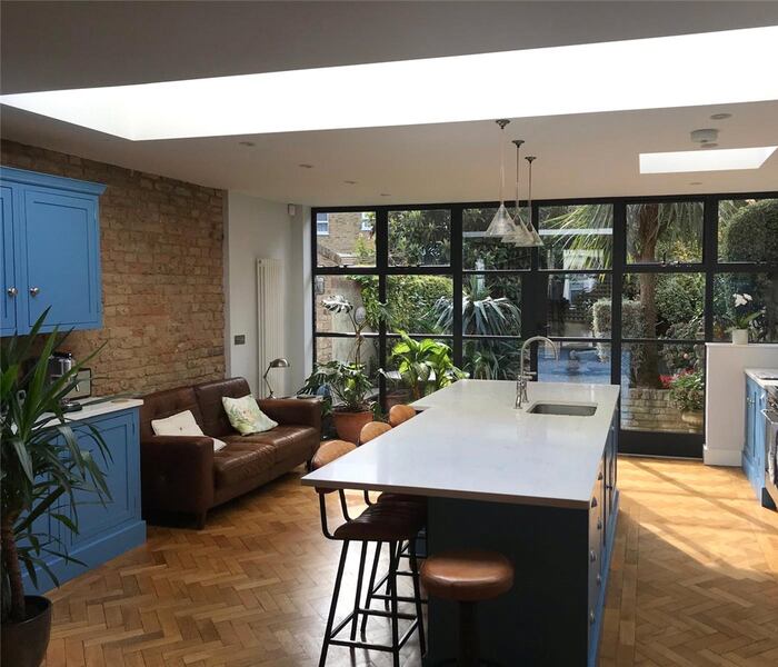 Sảnh vào trang nhã, nổi bật với gạch encaustic nguyên bản, dẫn lối vào phòng tiếp khách chính và mở ra dòng chảy không gian liền mạch trên toàn bộ tầng trệt. Sự gắn kết được nhấn mạnh bởi sàn gỗ parquet xương cá, được tái sử dụng từ một ngôi trường tại Yorkshire và lát xuyên suốt ngôi nhà. Ở phía trước, phòng tiếp khách với trần cao, cửa sổ bay lớn và lò sưởi Victorian tinh xảo tạo nên một không gian thanh lịch, đậm chất cổ điển. Khu bếp và phòng khách ngập tràn ánh sáng mang đến cảm giác rộng mở ấn tượng, đáp ứng trọn vẹn nhu cầu nấu nướng, dùng bữa, tiếp đãi và sinh hoạt. Hệ cửa kính phong cách Crittall mở ra khu vườn hướng Nam, lý tưởng cho sinh hoạt ngoài trời trong những tháng ấm áp.