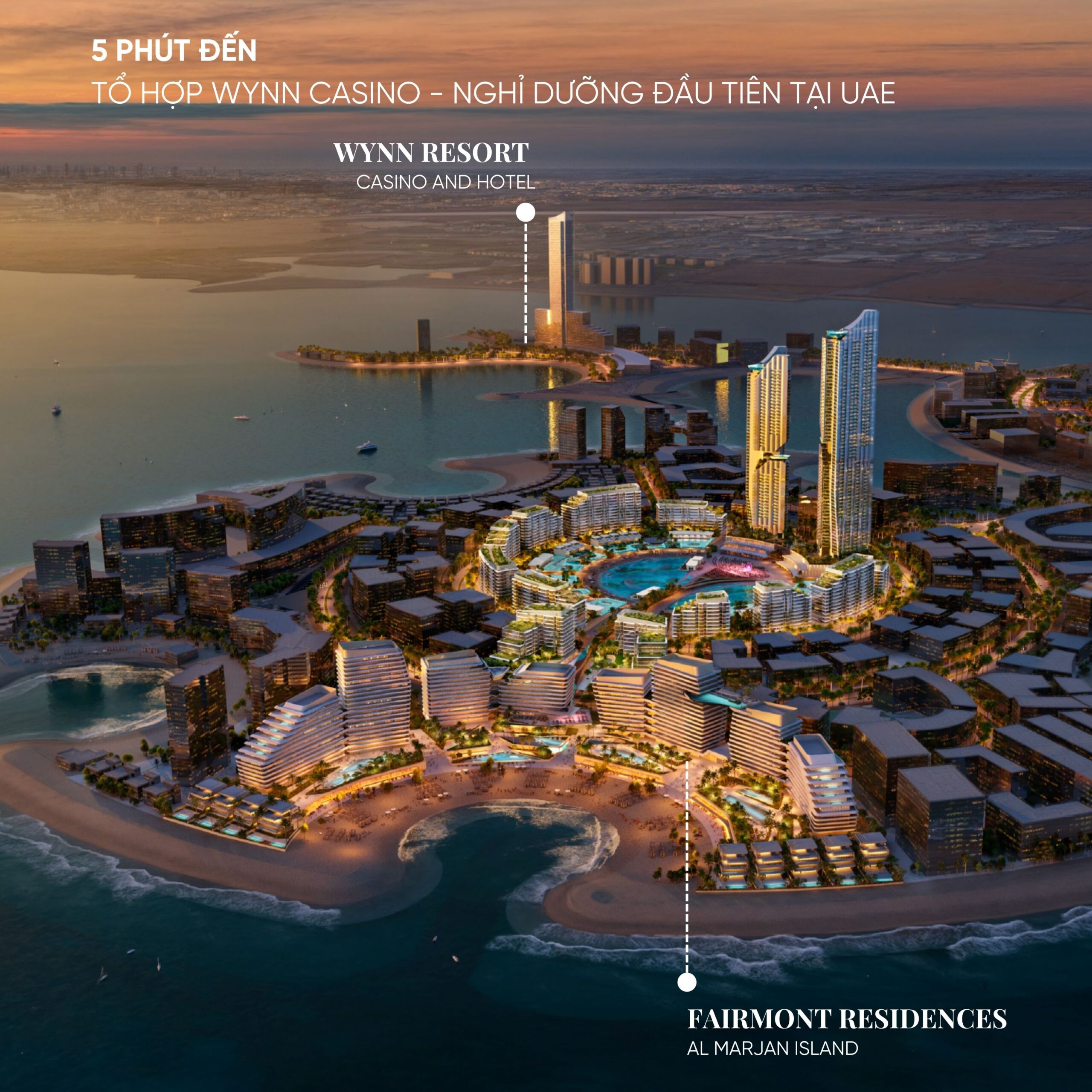 Fairmont Residences tọa lạc ngay trên đảo Al Marjan Island, cách dự án Wynn Al Marjan Island chưa đầy 2–3 km. Đây là khoảng cách cực kỳ chiến lược khi nhìn từ góc độ phát triển bất động sản và tiềm năng tăng trưởng. Thứ nhất, Wynn sẽ trở thành tâm điểm giải trí – du lịch đẳng cấp quốc tế đầu tiên tại Trung Đông, dự kiến thu hút lượng lớn khách thượng lưu từ châu Âu, Nga, Ấn Độ và các quốc gia vùng Vịnh. Việc Fairmont Residences nằm trong bán kính 5 phút di chuyển giúp dự án thụ hưởng trực tiếp lưu lượng khách khổng lồ, sức hút truyền thông và đà tăng trưởng hạ tầng mà Wynn kiến tạo trên khắp cụm đảo.