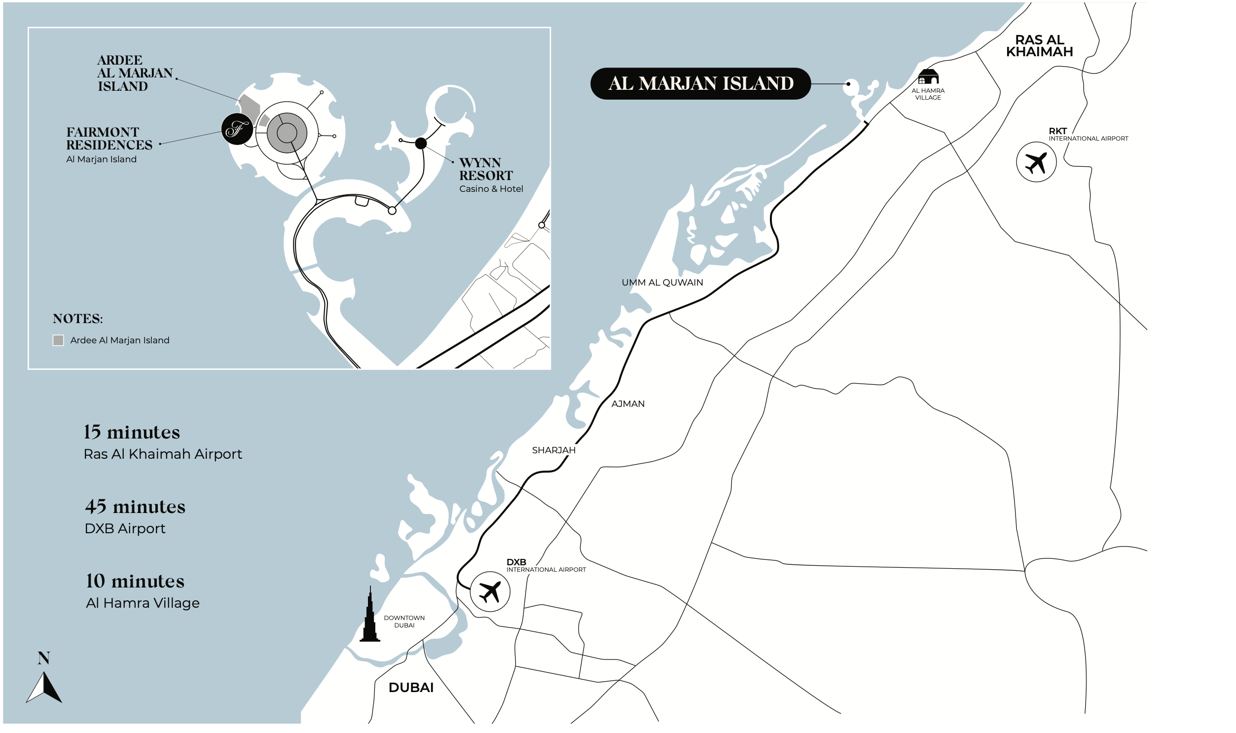 Nếu Dubai khiến cả thế giới phải trầm trồ ngưỡng mộ bởi Palm Jumeirah, thì hiện tại các nhà sưu tầm bất động sản hạng sang toàn cầu đang hướng ánh nhìn Al Marjan – thiên đường đảo nghỉ dưỡng, vui chơi giải trí chỉ cách Dubai 45 phút về phía Bắc. Ras Al Khaimah và đảo nhân tạo Al Marjan Island cũng chính là nơi đặt bước của tập đoàn Wynn – đế chế casino và resort cho dự án tổ hợp đầu tiên tại UAE, bán đảo Ả Rập. Việc Fairmont Residences nằm trong bán kính 5 phút di chuyển giúp dự án thụ hưởng trực tiếp lưu lượng khách khổng lồ, sức hút truyền thông và đà tăng trưởng hạ tầng mà Wynn kiến tạo trên khắp cụm đảo.