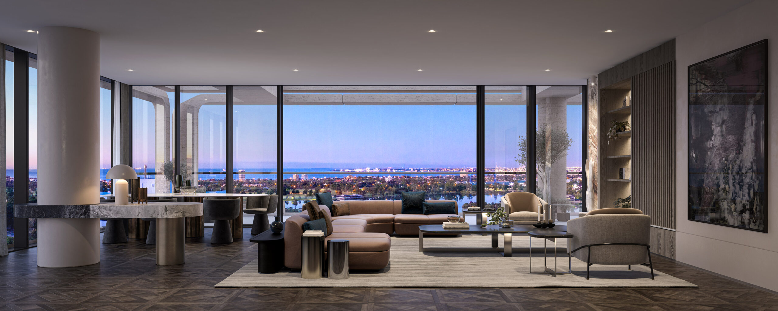 Tầm nhìn tại Sky Manor gần như không bị giới hạn: vào buổi sáng có thể nhìn ra Fawkner Park đang thức giấc; buổi chiều hướng về hồ Albert Park phản chiếu ánh hoàng hôn; ban đêm skyline của Melbourne CBD mở ra như một bức tranh ánh sáng. Thiết kế phòng khách dạng bo góc, cửa kính rộng sát trần và ban công mở giúp chủ nhân cảm nhận được sự rộng lớn của không gian giống như sống trong một penthouse thu nhỏ.
