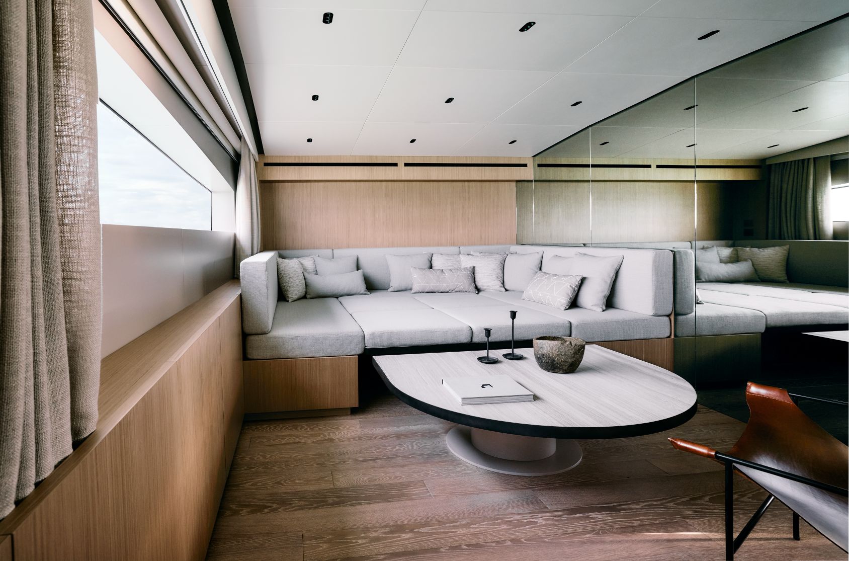 Ở mũi tàu, phòng ăn tròn nhẹ nhàng ôm lấy góc nhìn bao trọn biển; phía sau là salon thanh thoát liên kết trực tiếp với boong sau. Không gian sinh hoạt được phân tách bằng chức năng, nhưng lại thống nhất trong cảm giác – tinh tế, tĩnh lặng và đầy chiều sâu.