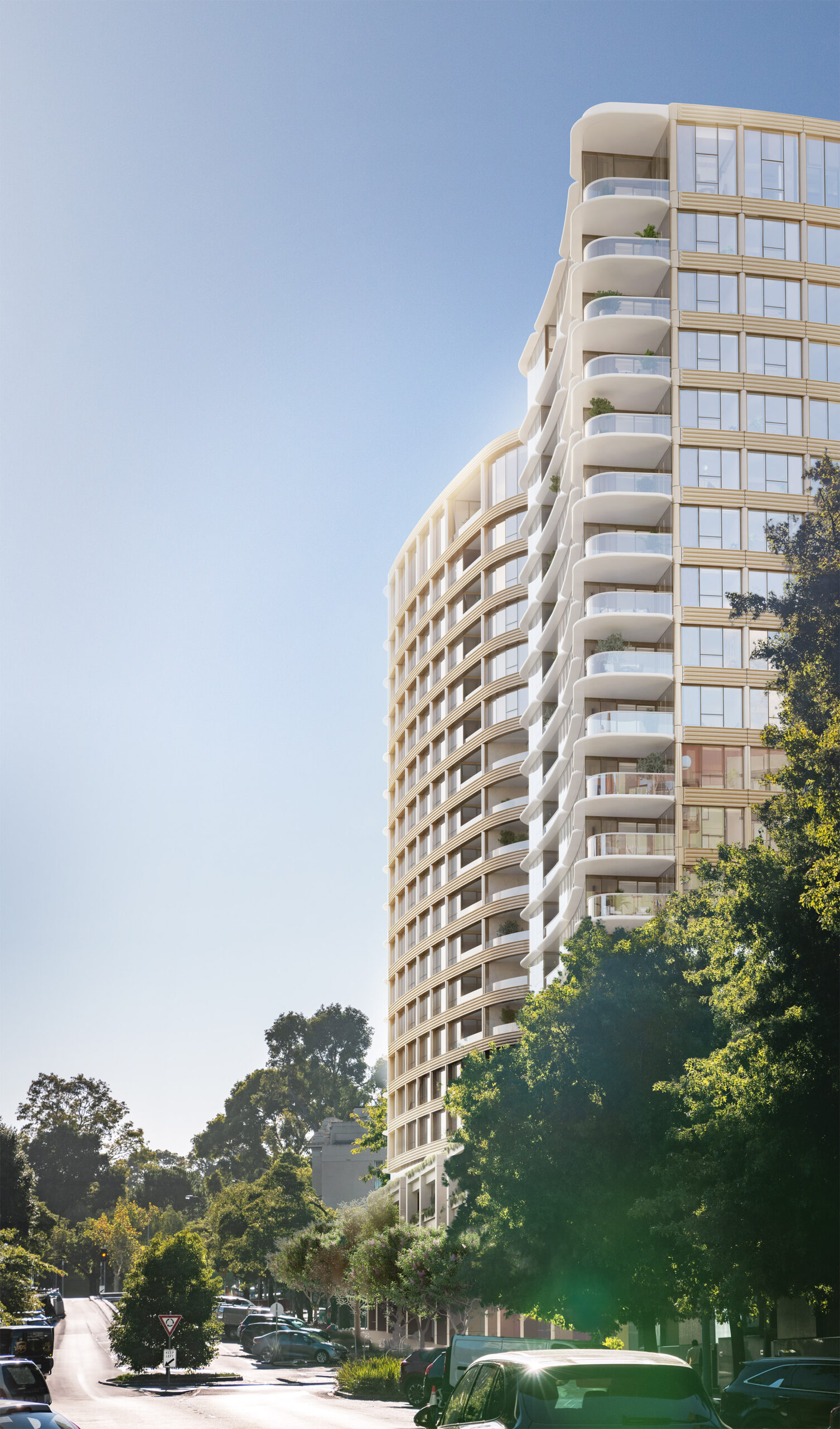 Ở Park Modern, Bates Smart tiếp tục phát triển triết lý ấy bằng một ngôn ngữ kiến trúc mềm mại và có chiều sâu. Thay vì những đường nét sắc cạnh hay một khối nhà cứng, Park Modern được tạo hình bằng đường cong uyển chuyển như đang chuyển động theo gió và tán cây của Royal Botanic Gardens và thiên nhiên rộng mở của Domain Precinct. Mặt đứng tòa nhà được xử lý để ánh sáng, bóng cây và sắc độ thay đổi của bầu trời trở thành một phần của trải nghiệm sống. Vật liệu và tông màu cũng được chọn lọc để tương thích với bối cảnh chính của khu vực. Đó là tông màu của đá và kim loại gợi nhắc khéo léo đến Shrine of Remembrance ngay cạnh bên, giúp công trình không lạc lõng giữa cảnh quan di sản mà trở nên hòa hợp và tôn vinh vẻ đẹp tự nhiên vốn có.