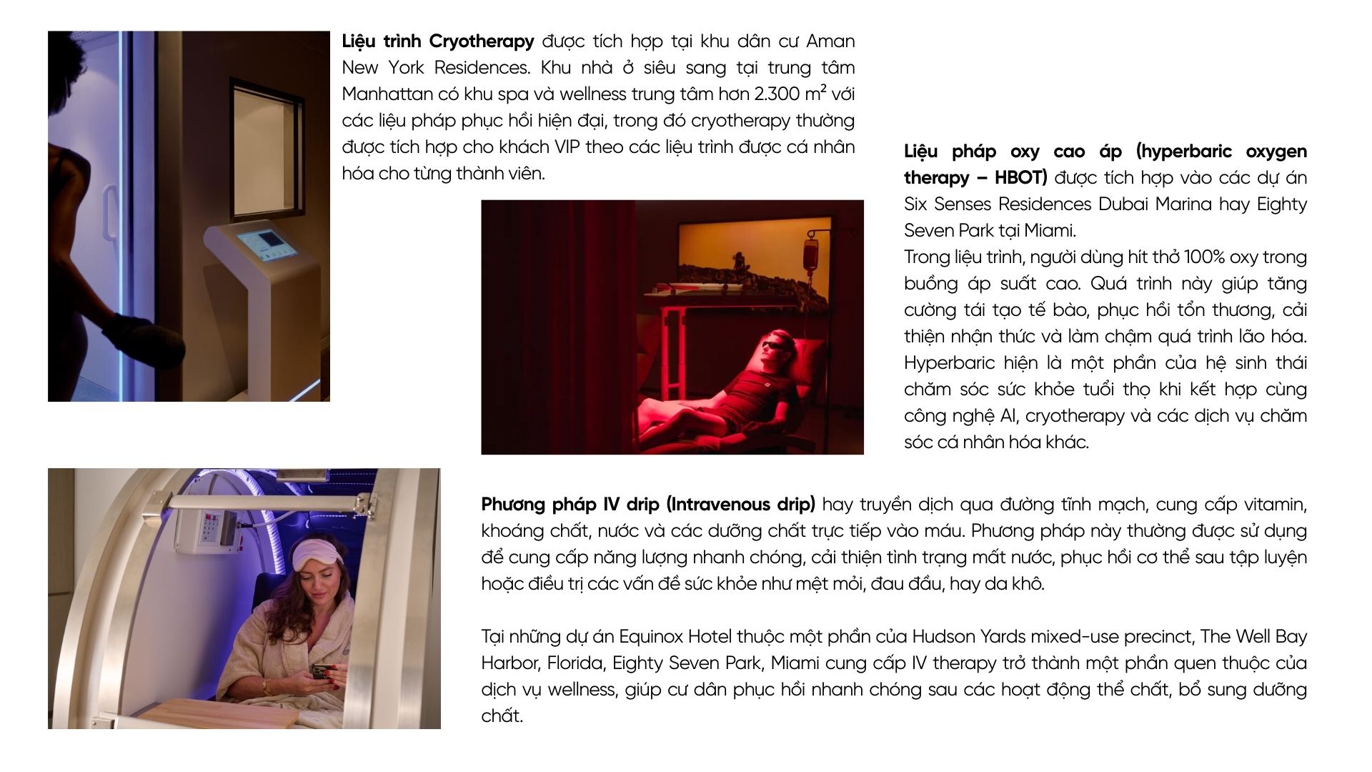Công nghệ Cryotherapy đang được tích hợp như một tiện ích chăm sóc sức khoẻ tiêu chuẩn trong các bất động sản cao cấp ở Mỹ và châu Âu. Cryotherapy được biết đến như một phương pháp trị liệu sử dụng nhiệt độ cực thấp để giảm viêm, phục hồi cơ thể, làm chậm quá trình lão hóa và cải thiện sức khỏe tổng thể. Liệu pháp này phổ biến nhất dưới hình thức whole-body cryotherapy (WBC) – nơi người dùng đứng trong buồng lạnh từ -110°C đến -140°C trong vòng 2–3 phút.