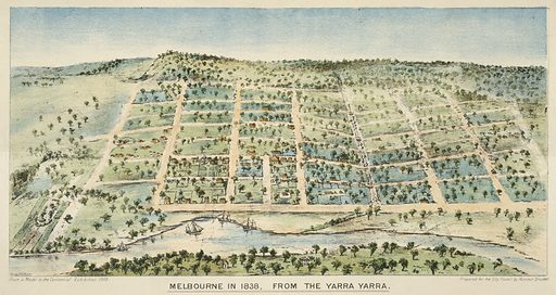 Ảnh: Bản đồ vẽ “Ngữ pháp đô thị” Melbourne từ góc nhìn bên kia sông Yarra Yarra (1838)