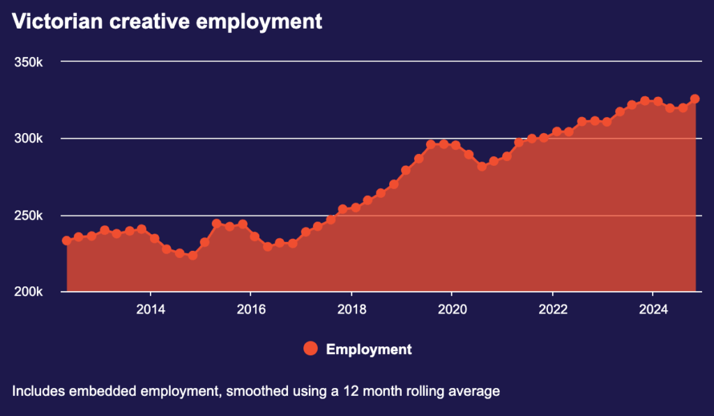 Ảnh: Sơ đồ cho thấy nguồn nhân lực việc làm sáng tạo thay đổi theo thời gian. Trước đại dịch, nhu cầu tuyển dụng vẫn tăng trưởng đều đặn qua từng năm và phục hồi mạnh mẽ vào năm 2020-21, sau đại dịch. (nguồn: Employment data, Victoria’s creative economy)