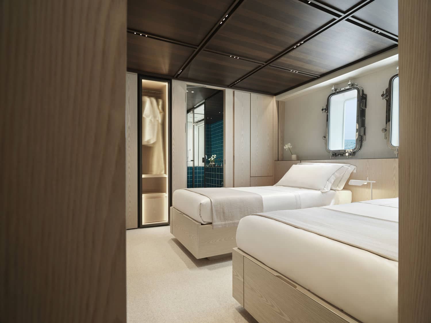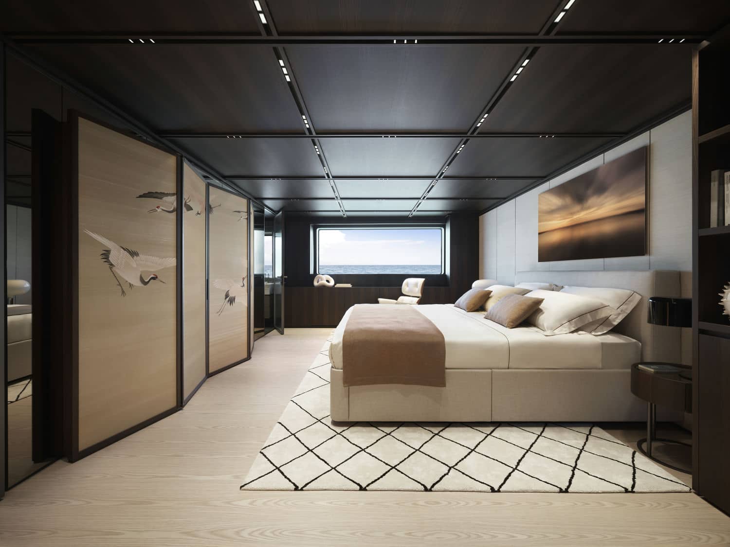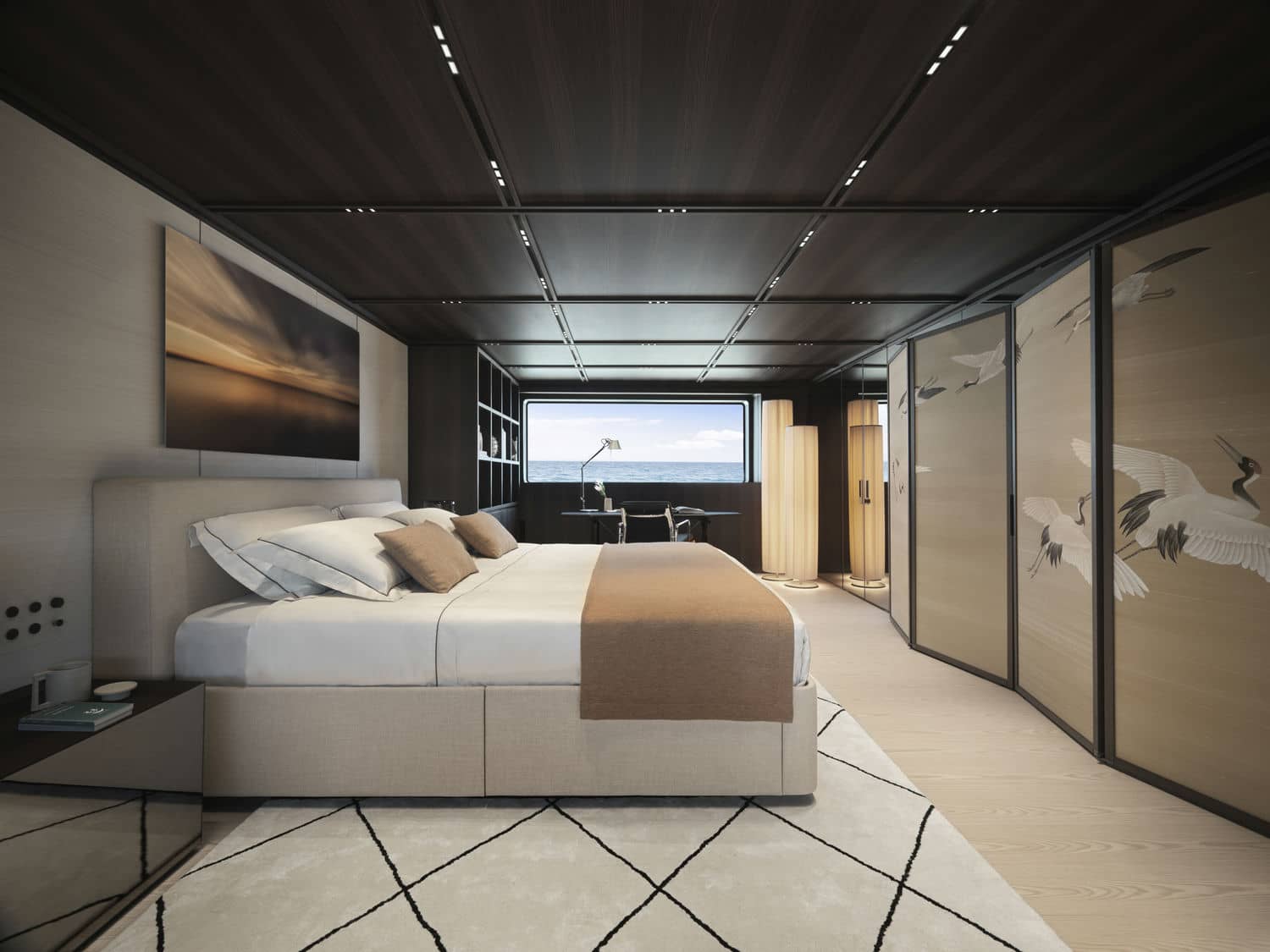 Bên trong CONTIGO, mọi thứ đều hướng đến sự tĩnh lặng. Suite chủ nhân trên boong giữa được bố trí như một không gian trú ẩn thực thụ, với văn phòng riêng, hai phòng thay đồ và phòng tắm khép kín, nơi ánh sáng được kiểm soát vừa đủ để không gian luôn giữ được sự dịu nhẹ.