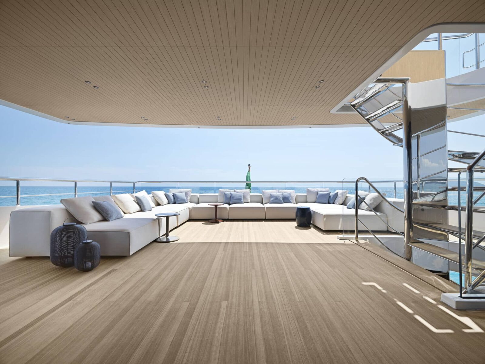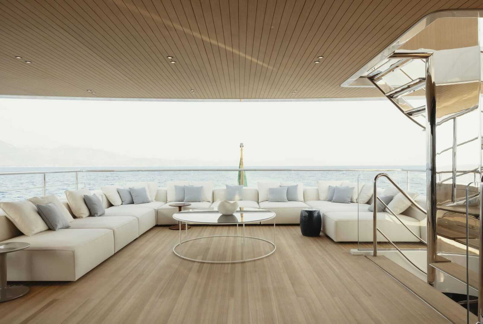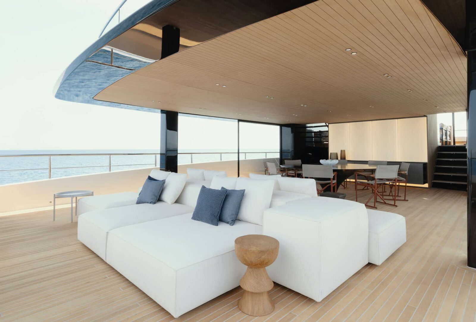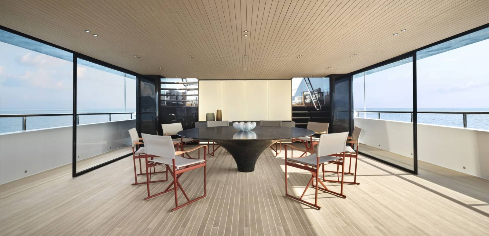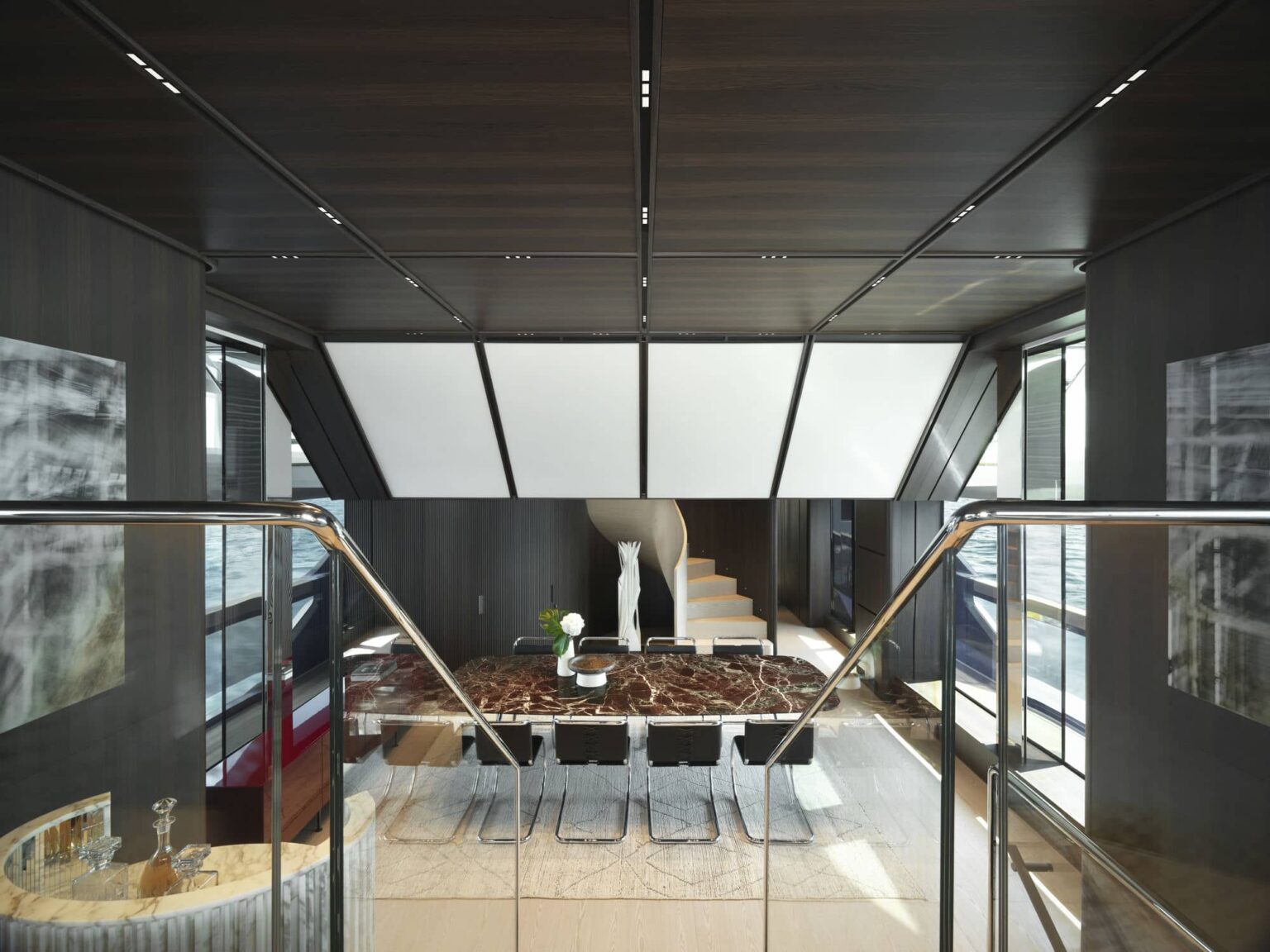 Trung tâm của chiếc du thuyền là Ocean Lounge rộng mở ở mực nước biển, nơi beach club 135 m² có thể mở hoàn toàn, kết nối trực tiếp với đại dương. Ánh sáng tràn vào từ cầu thang kính chạy xuyên suốt các boong, đưa ánh nhìn di chuyển liên tục giữa phòng gym, salon chính, khu dining mezzanine và các không gian lounge phía trên.